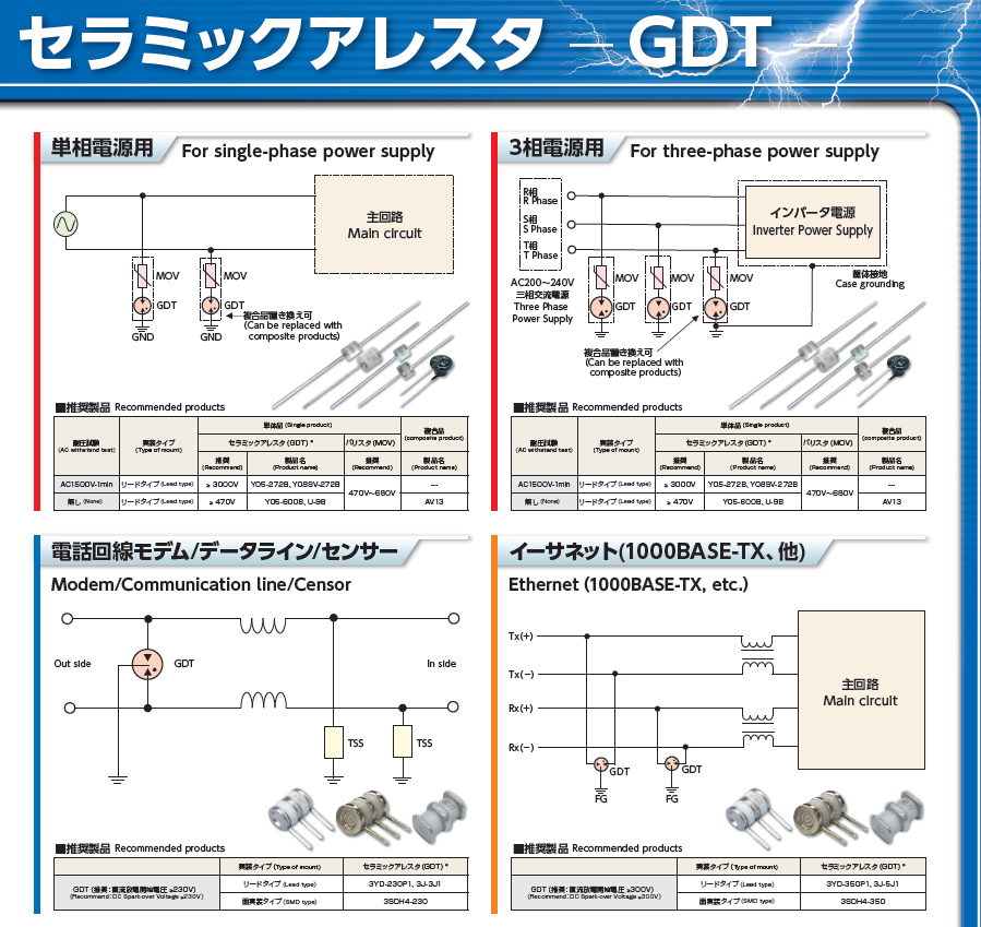 自產品問世以來,GDT 廣泛應用於通信與訊號線路的雷擊保護,目前已推出超過百種規格型號,涵蓋各種電壓與封裝形式,滿足不同應用需求。如未在網站上找到所需的形狀或電壓規格,歡迎與我們聯繫,我們將為您提供對應建議或客製化方案。